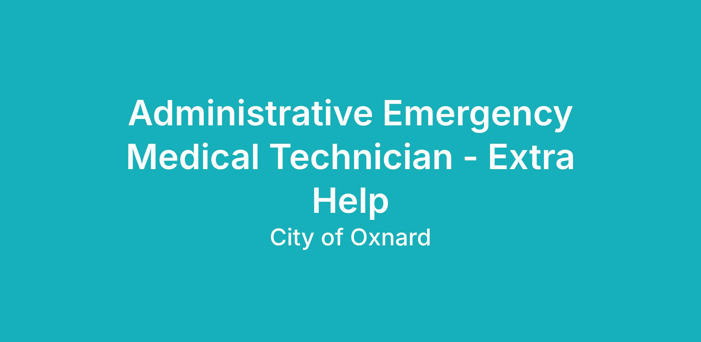 The City of Oxnard’s Fire Department is seeking an Administrative Emergency Medical Technician (EMT) - Extra Help with strong technical and customer service skills to be a part of the team. The ideal candidate is hard-working and enjoys helping others.