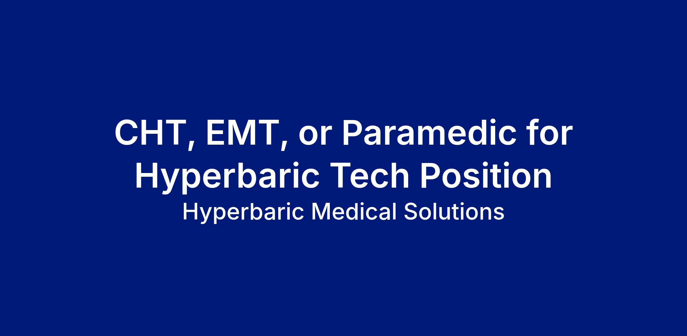 Hyperbaric technologists (HBO Tech) have direct interaction with patients and oversee their care process every day. As a result, our HBO Techs are invaluable to creating and maintain a safe and extraordinary experience at Hyperbaric Medical Solutions. HBOT care is daily, so patients develop strong bonds with our staff, especially the HBO Techs - a relationship that is developed through trust and confidence in the expertise of each technologist. HMS is seeking Certified Hyperbaric Technologists (CHT), Paramedics, EMTs, and experienced Hyperbaric Technologists, but will train non-experienced candidates who demonstrate thoughtful attention to detail, and who take ownership of process and practice operations. Candidate must be willing to work in a collaborative, team environment. This position will work closely with clinical and administrative staff at both this office, as well as at other HMS locations.