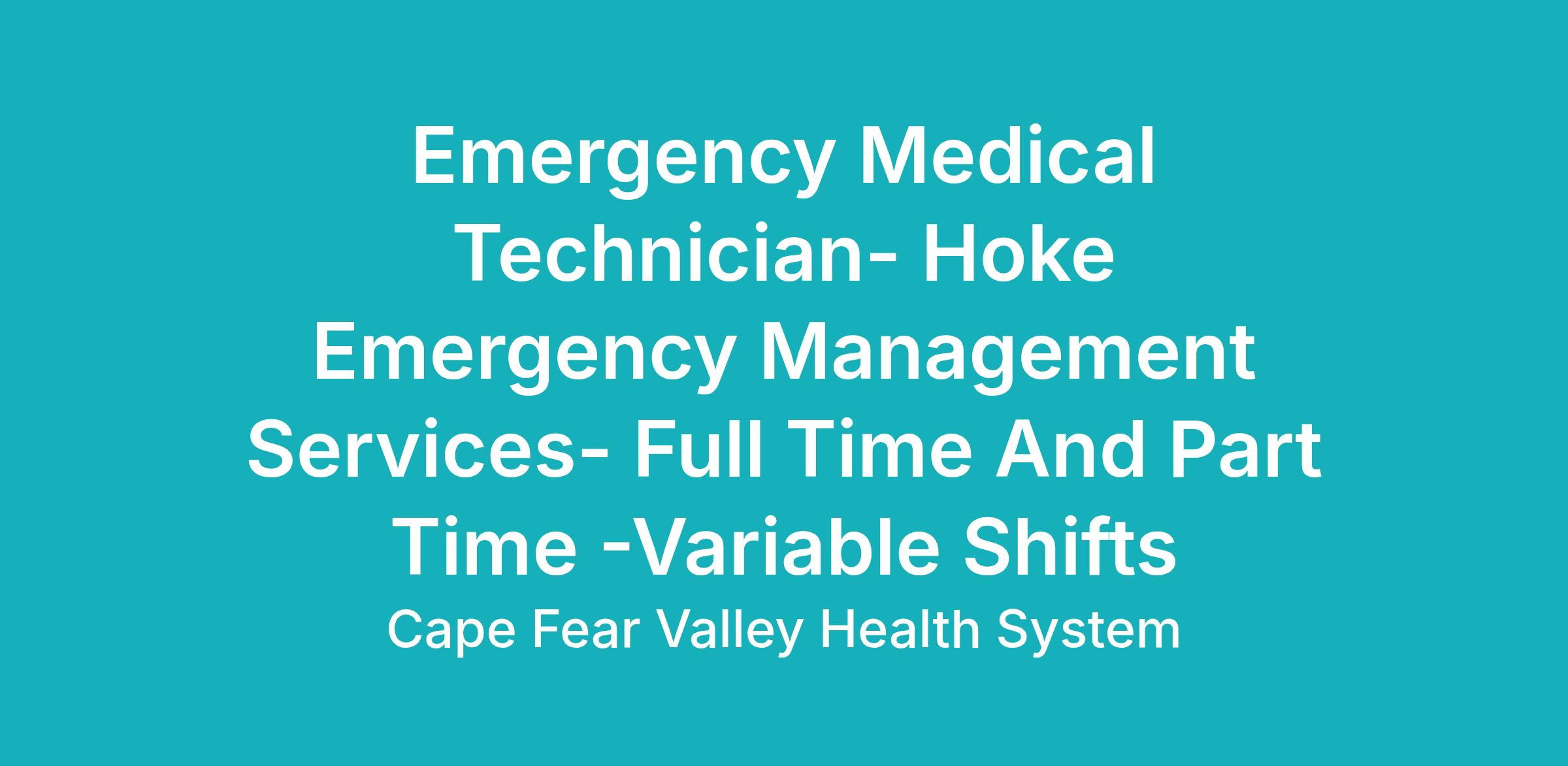 EMT - NC Office Of Emergency Medical ServicesCape Fear Valley Health System is an Equal Opportunity Employer M/F/Disability/Veteran/Sexual Orientation/Gender Identity