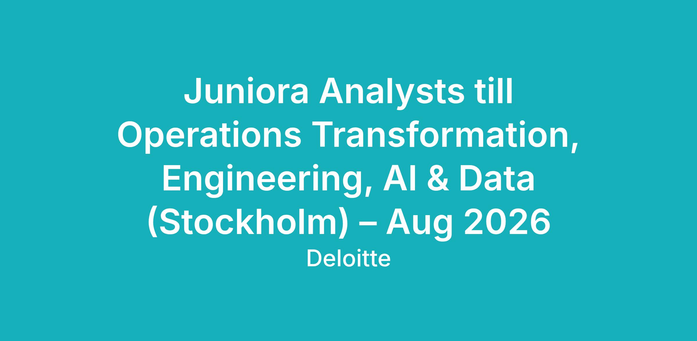 På Deloitte gör ditt arbete en meningsfull skillnad, varje dag, medan du växer i en inkluderande företagskultur av samarbete och hög prestation. Utöver att skapa lösningar strävar vi efter att göra en positiv och avgörande skillnad för andra i vår omgivning, våra klienter och samhället. På Deloitte hittar du tidigare dolda möjligheter att lyckas och inser din fulla potential.
