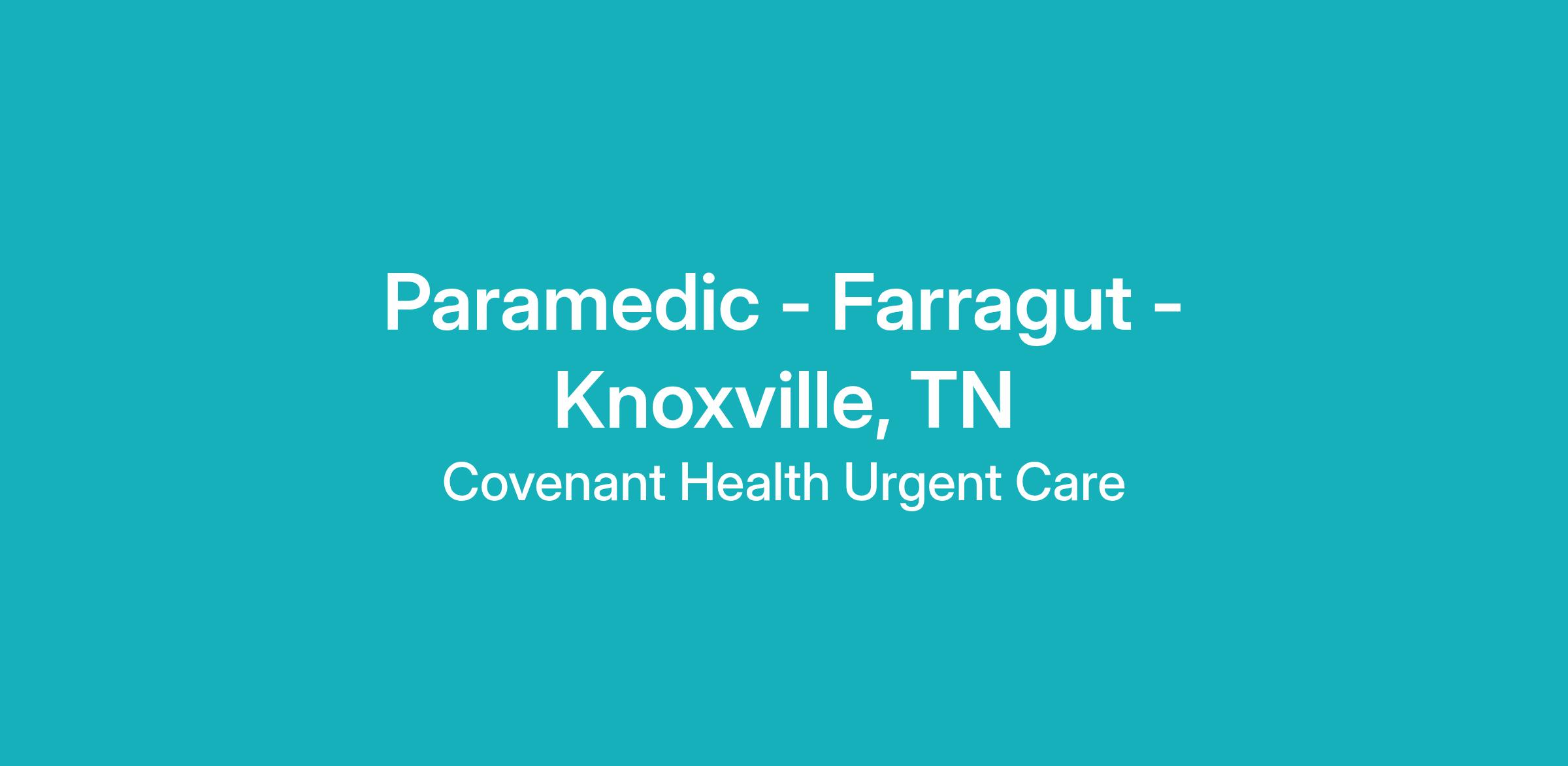 Covenant Health Urgent Care is dedicated to providing top-quality patient care to the Knoxville community. Paramedics are vital to the success of our clinical teams and crucial to providing fast, friendly, and affordable healthcare at Covenant Health Urgent Care centers. In partnership with Covenant Health, Covenant Health Urgent Care offers state-of-the-art onsite digital X-ray, EKG, and common laboratory assays 7 days per week, 8AM - 8PM.
