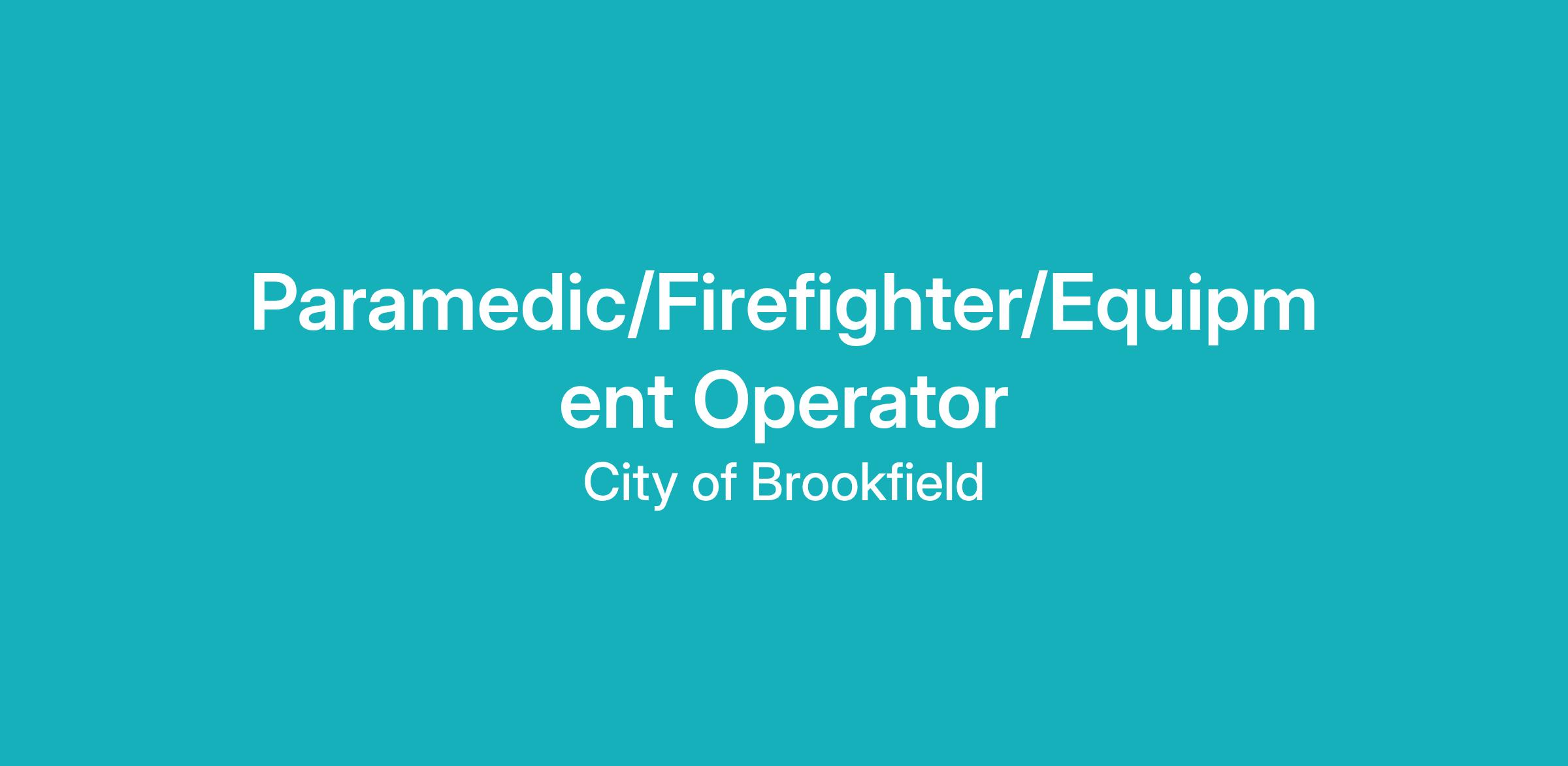 PURPOSE: The Paramedic/Firefighter/Equipment Operator performs duties in support of the functions of the Brookfield Fire Department including, fire suppression, emergency medical services, public education, fire prevention, training, and maintenance activities. This position is also responsible for operating assigned apparatus in an efficient, safe manner and performing advanced emergency medical care to ensure that emergencies are resolved promptly.
