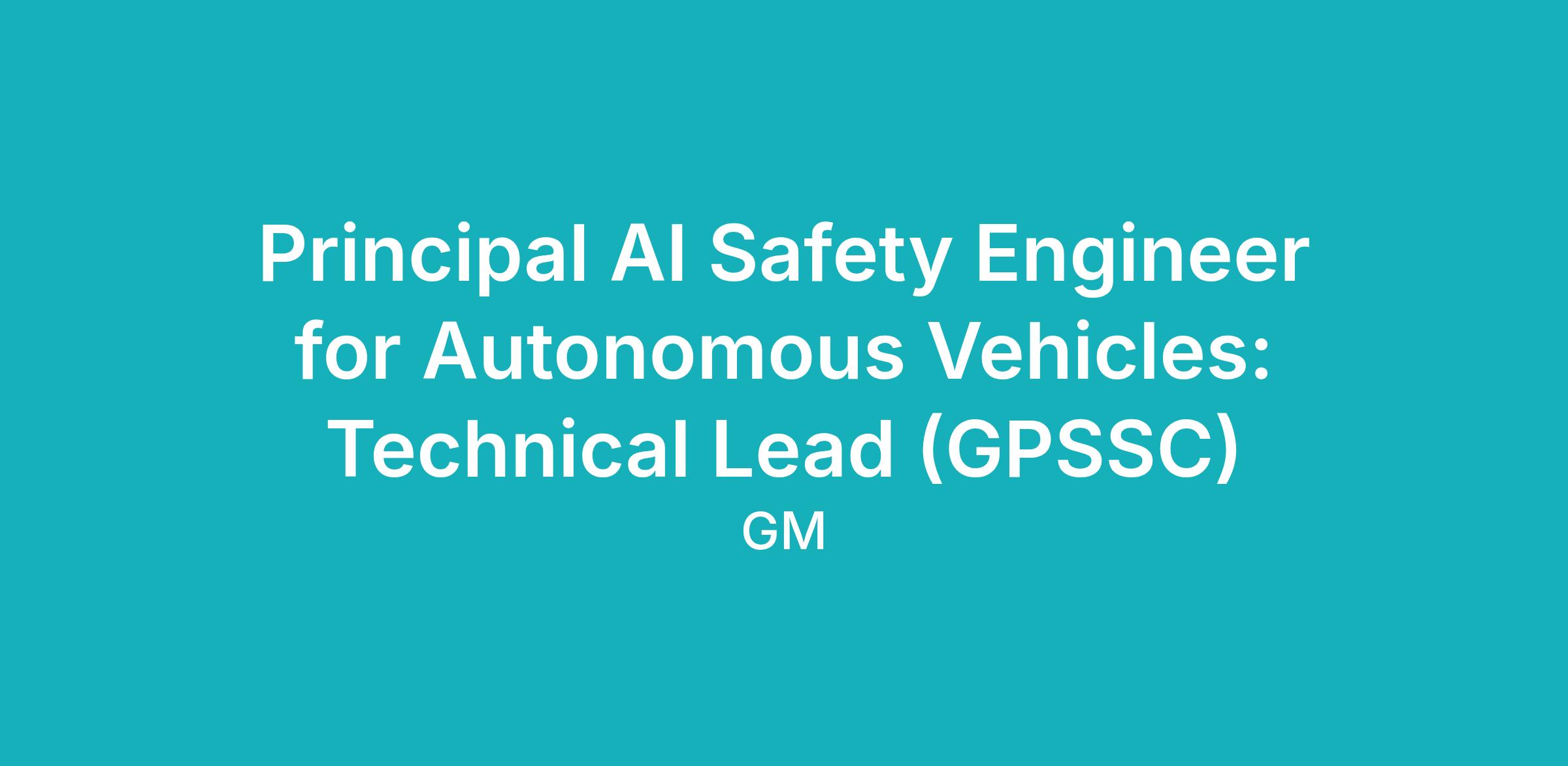 The AV Safety Strategy and Assessment team is seeking an AI Safety Technical Leader with deep experience across the full end‑to‑end development lifecycle of automated driving system (ADS) technology driven by artificial intelligence and machine learning models. As the AI Safety Principal Engineer, you will stay current on industry best practices and standards while guiding the development of GM’s AI safety strategy for autonomous vehicles (AV). This role requires significant experience driving the technology development and validation of AI models for safety‑critical applications. The ideal candidate will bring strong AI domain expertise across safety engineering, data lifecycle management, model development, verification and validation, frameworks and tools, and operational assurance.